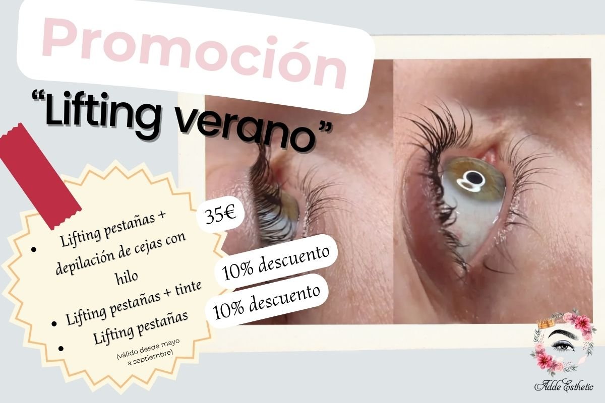 Ofrecemos 3 promociones para este verano: Lifting pestañas + depilación de cejas con hilo - 35€ Lifting pestañas + tinte - 10% descuento Lifting pestañas - 10% descuento